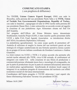 U.C.E.E.31 gen 2007Tempo di lettura: 1 minCOMUNICATO STAMPA U.C.E.E. - Costituita la Joint-venture fra la U.C.E.E.e la TSTK/Turkey.Aggiornato il: 17 mag 201918 Gennaio 2007 - Milano - Italy - 31/01/2007 0 visualizzazioni0 commenti